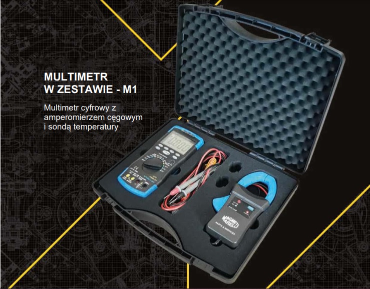 Multimetr w zestawie - M1 jest przenośnym, uniwersalnym miernikiem cyfrowym, charakteryzującym się wysoką dokładnością, rozdzielczością i powtarzalnością pomiarów. Łatwy w użyciu, z funkcją ochrony przed przepięciem i przeciążeniem, nadaje się do wykrywania: