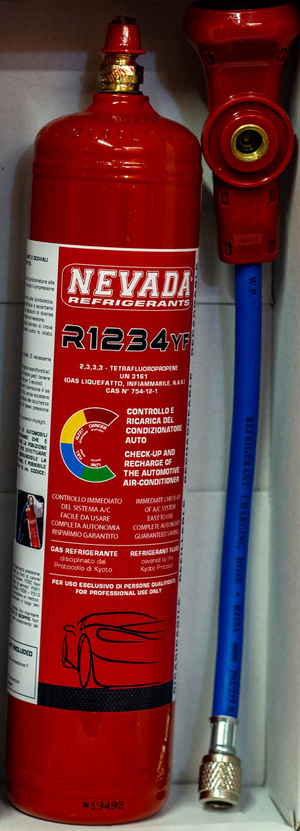 Czynnik chłodniczy R1234yf w 700-gramowym cylindrze z pistoletem dozującym (certyfikowany T-PED / EN 13322-1).