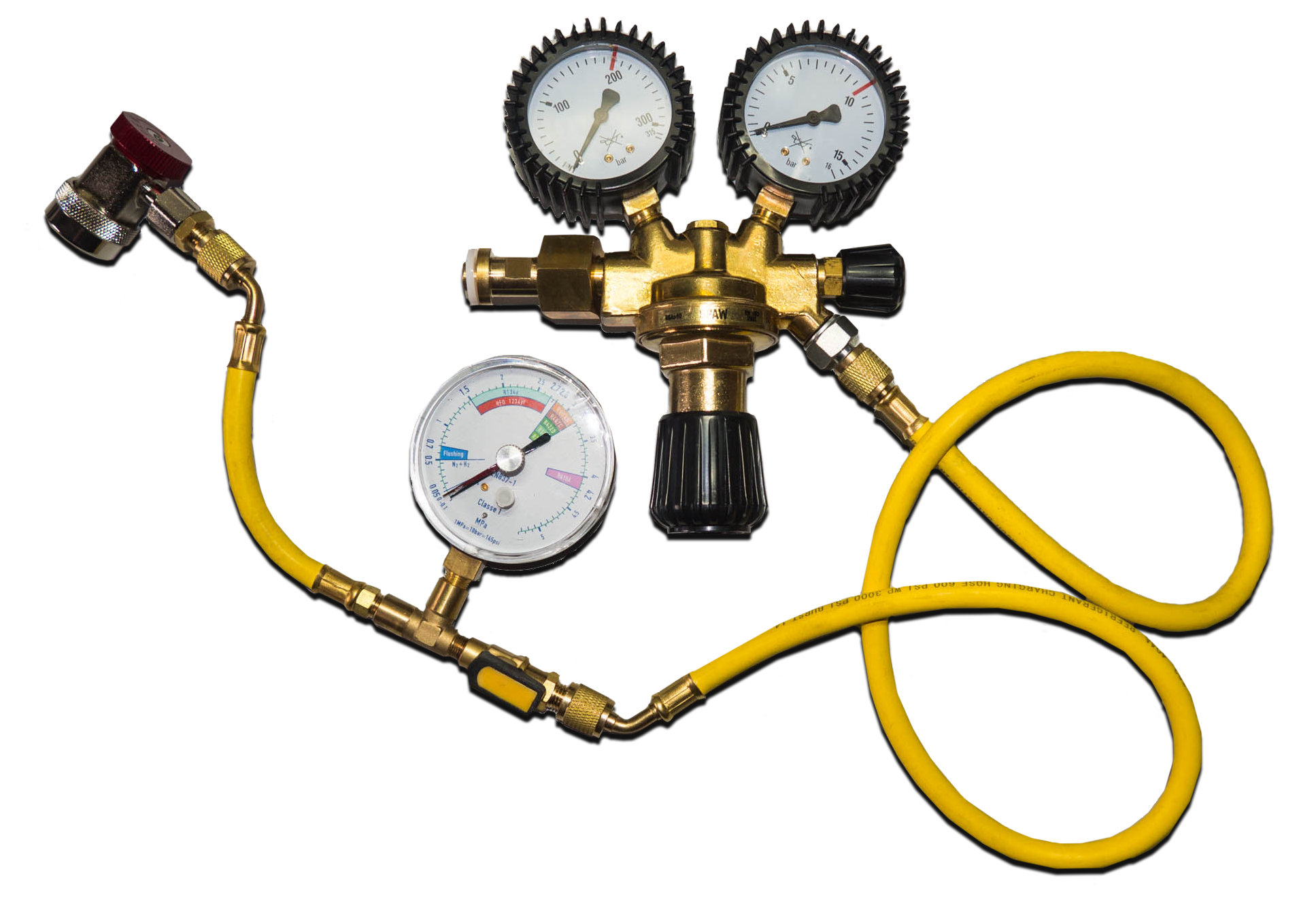 Idealnie nadaje się do obsługi klimatyzacji lub wyszukiwania nieszczelności za pomocą azotu lub do użytku z czynnikami chłodniczymi. Wskaźnik posiada znacznik dzięki któremu możemy zaznaczyć początkowe ciśnienie referencyjne a następnie obserwować jego spadki lub wzrosty. Skala manometru jest cechowana w stopniach ciśnienia, w barach. Zestaw gotowy do pracy wyposażony w reduktor który pozwala na testowanie z ciśnieniem do 16 bar