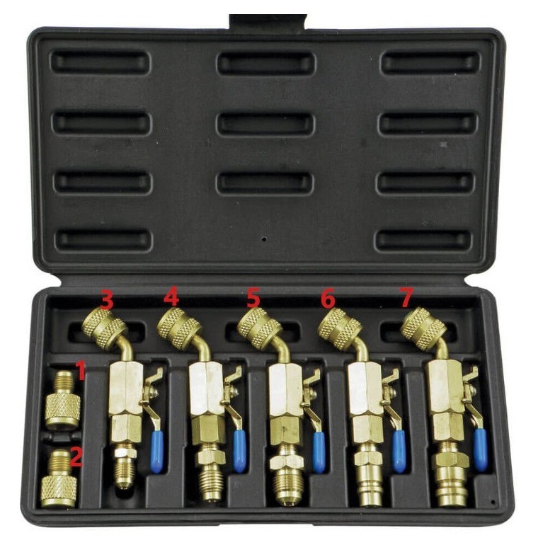 Zestaw 7 adapterów służących do połączenia urządzeń serwisowych z układem klimatyzacji lub chłodniczym. Pomocne w przypadku nietypowych przyłączy w urządzeniu.