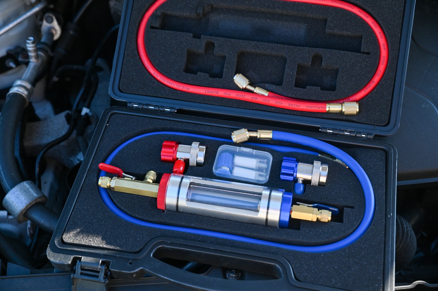 Tester podpinamy do złącza niskiego ciśnienia oraz złącza wysokiego ciśnienia by napełnić cylinder czynnikiem i olejem znajdującym się w klimatyzacji samochodowej.